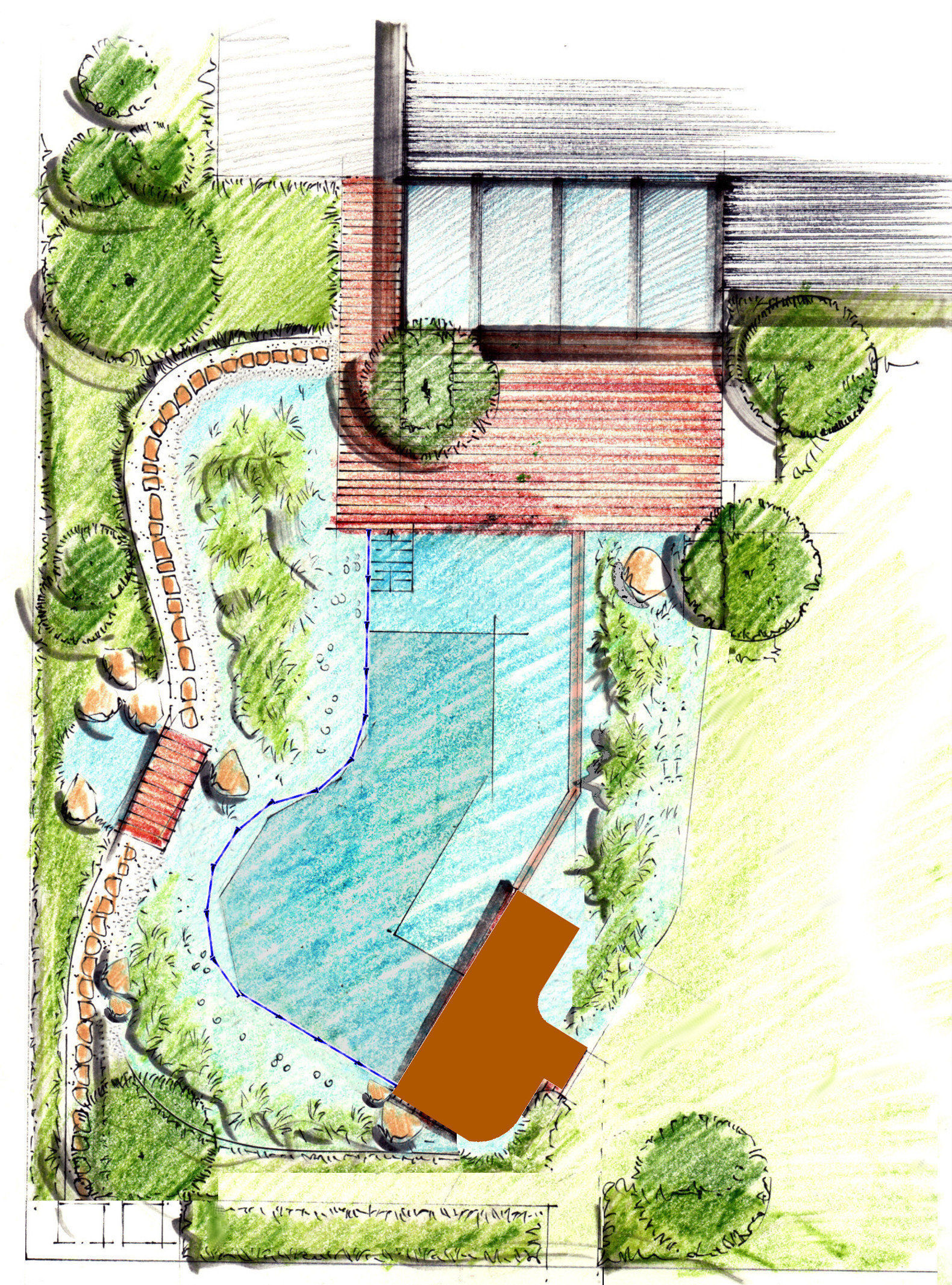 Heraus kam dabei ein Schwimmteich, der in Winkelelementbauweise mit Wasserkreislauf, Pflanzenfilter, Skimmer, Steg, Brücke und Holzterasse angelegt wird. Bei einer Wassertiefe von 1,40 bis 2,00 m, ist der Schwimmbereich ca. 42 qm groß und wird von einem ca. 53 qm großen Regenerationbereich mit Pflanzen umgeben sein. Selbstverständlich dürfen hierbei dann auch die obligatorischen Seerosen nicht fehlen.